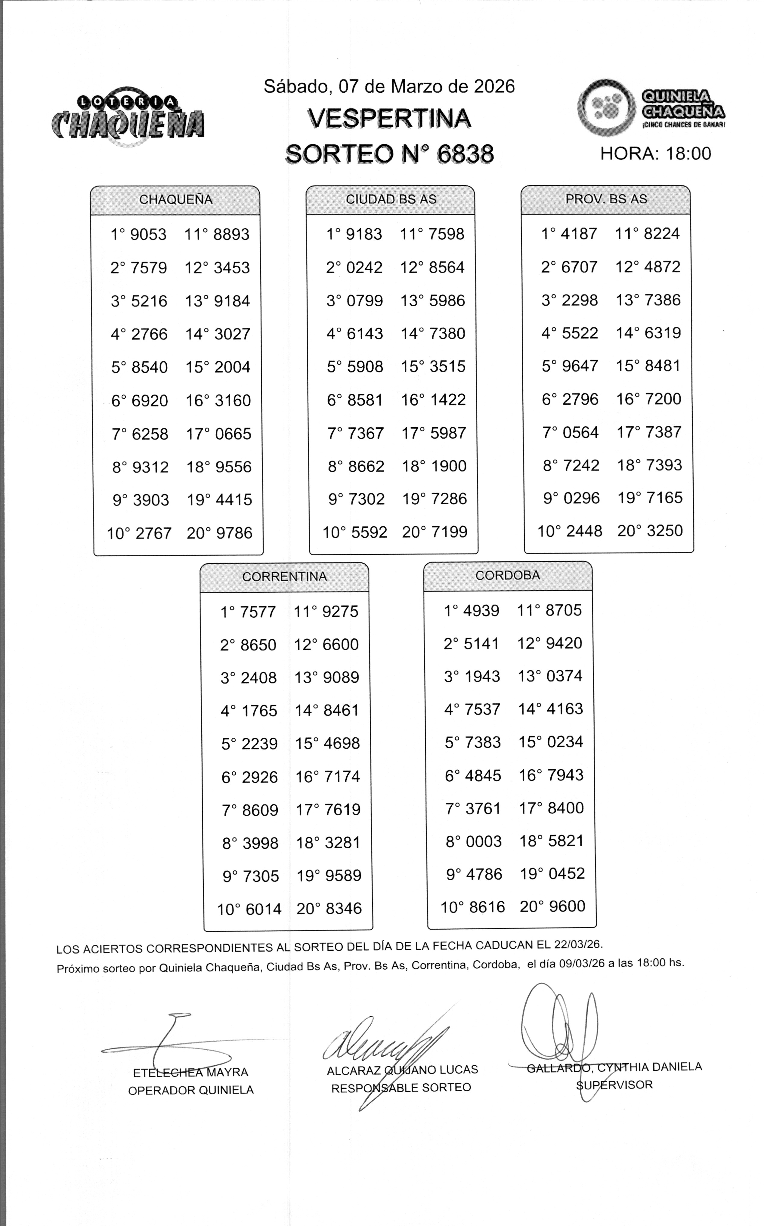 - N° de Sorteo: 6838